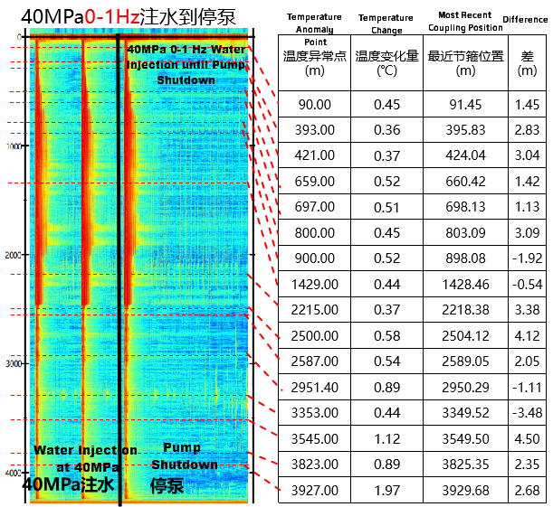 Observation: Analysis of fiber-optic leak detection logging data identified 16 distinct temperature anomaly points via DTS. DAS waterfall plot analysis showed that acoustic energy anomalies corresponded closely with these temperature anomalies.
